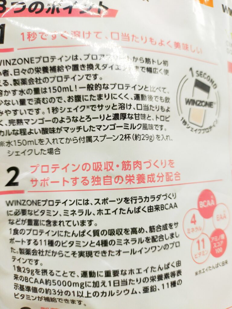 私は日本新薬さんのホエイプロテイン(完熟マンゴーミルク風味)をゴクリ