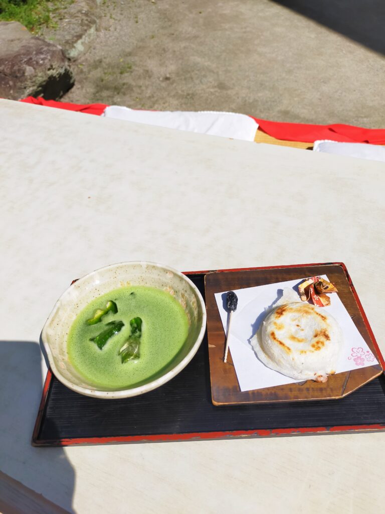 「太宰府名物」梅ヶ枝餅と抹茶セットで一休み😁もちろん愛犬(マリン)も、おやつで一休み✨お餅のあんこが、ほのかに甘くて疲れた身体を癒やしてくれます😃
