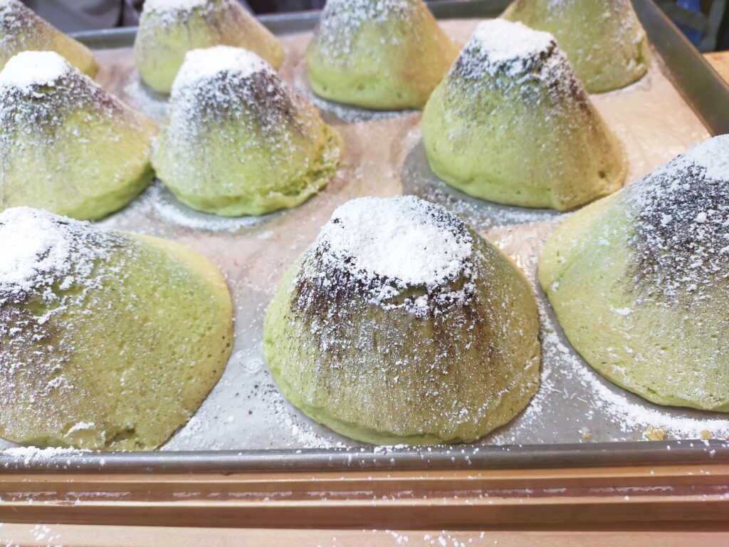 富士山型に焼き上げたメロンパンの上に、ココアパウダーと雪のように真っ白なシュガーパウダーがかかっていて、サクサクふわふわで、とても美味しいですよ😃